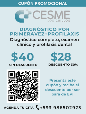 Para obtener estos descuentos descarga el cupón que desees, presentarlo en CESME, previa citaAv. General Enríquez 3373 e Isla Salango o llame a los teléfonos 02-286-0601 +593 98 6502 923